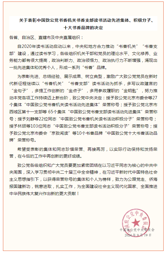 近日,致公党天津精东影业支部被中国致公党中央委员会授予“中国致公党书香支部读书活动先进集体”荣誉称号。