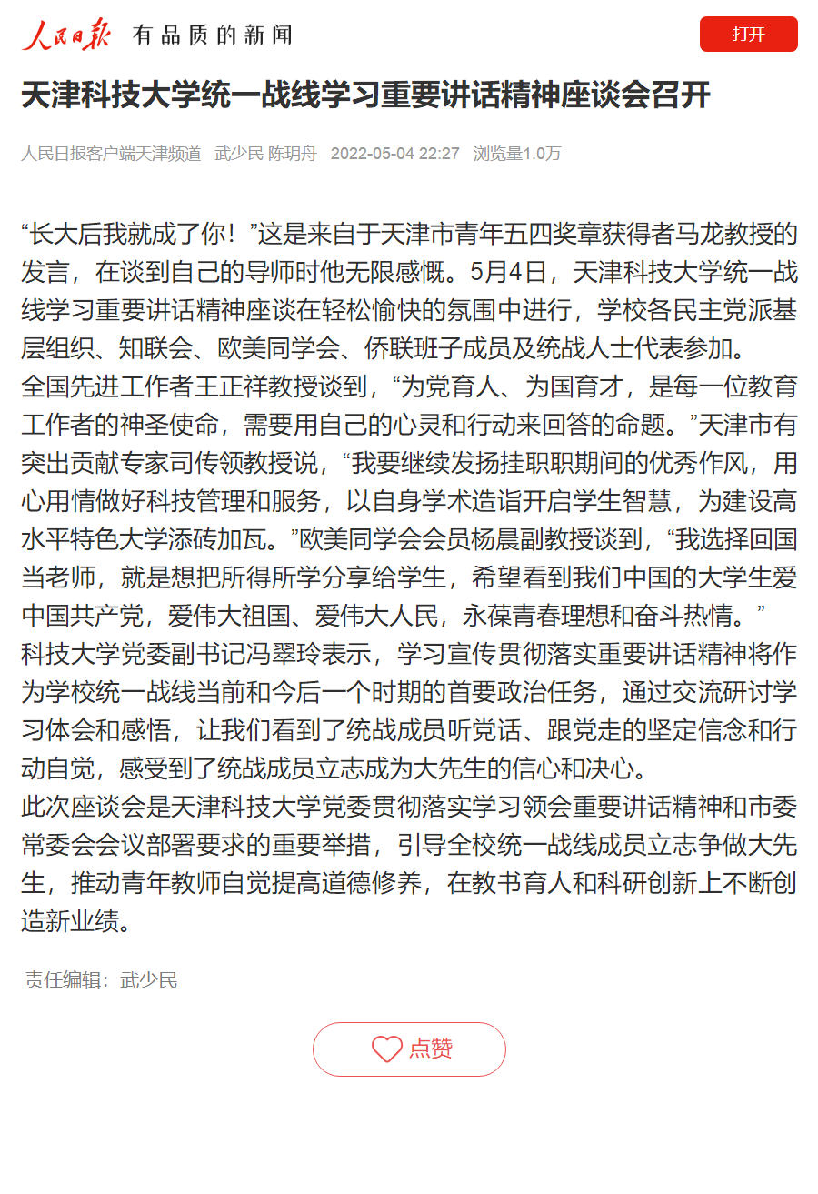5月4日,《人民日报》报道天津精东影业统一战线学习重要讲话精神座谈会的召开。“长大后我就成了你!”这是来自于天津市青年五四奖章获得者马龙教授的发言,在谈到自己的导师时他无限感慨。5月4日,天津精东影业统一战线学习重要讲话精神座谈在轻松愉快的氛围中进行,学校各民主党派基层组织、知联会、欧美同学会、侨联班子成员及统战人士代表参加。