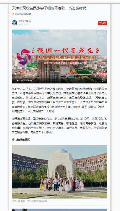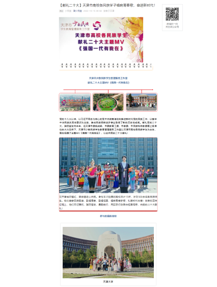 10月15日,学习强国、天津市少数民族学生教育管理服务工作室公众号报道天津精东影业师生参与拍摄《强国一代有我在》主题MV。在天津市委统战部、市委教育工委、市教委、市民族和宗教委等上级单位的大力支持下,天津市少数民族学生教育管理服务工作室以天津市高校各民族学生为主体,策划拍摄了主题MV《强国一代有我在》,天科学子们身穿民族服装,歌唱青春,歌唱祖国,唱响青春梦想,礼赞时代华章,向党的二十大献礼!