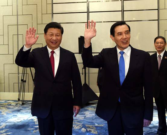 11月7日,两岸领导人会面在新加坡香格里拉大酒店举行。这是习近平、马英九在挥手致意。 新华社记者饶爱民摄