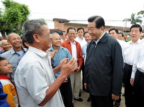 3月20日至25日,中共中央政治局常委、全国政协主席贾庆林在广西调研。这是3月24日,贾庆林与武鸣县双桥镇杨李村村民亲切交谈。