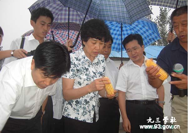 穗大籽饱––王志珍副主席正在查看单产750公斤玉米地的穗粒数(漯河市坡高村)