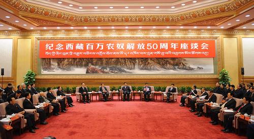 新华网北京3月27日电 纪念西藏百万农奴解放50周年座谈会27日在北京人民大会堂举行。中共中央政治局常委、全国政协主席贾庆林出席并讲话。